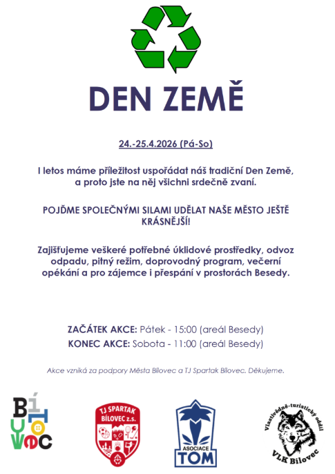Den Země Přilož ruku k dílu a oslav s námi Den Země!Čeká nás úklid, dobrá nálada i společně strávený čas.📅 24.–25. dubna – přijď i ty!